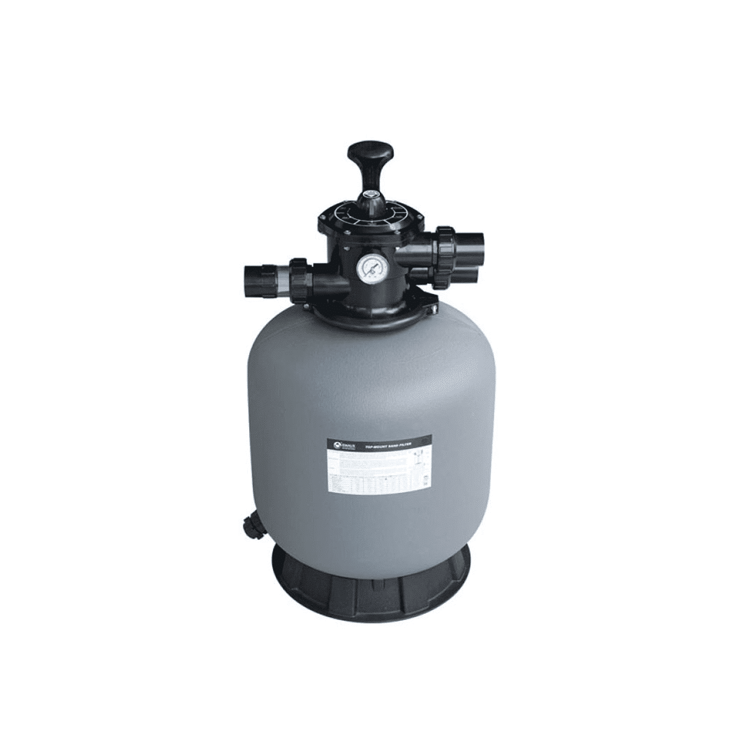 Filtro de arena fabricado en PE de alta densidad. Diseñado para la mayoría de las piscinas y spas domésticos. La cerradura de abrazadera está diseñada para una rotación de 360°, para una fácil instalación.