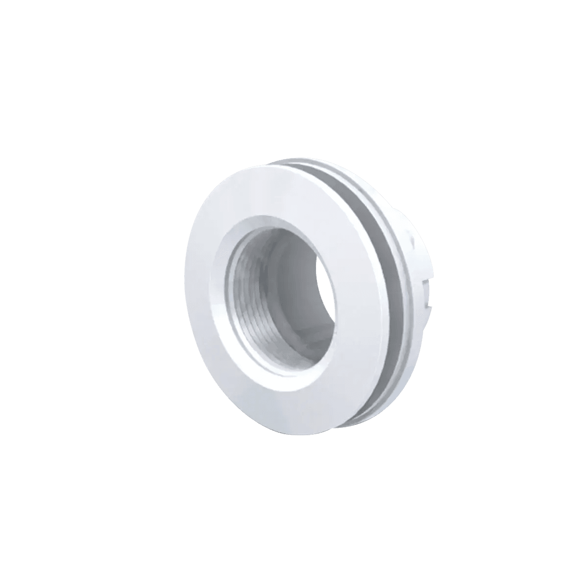 Virola Vulcano para piscina de fibra de vidrio. Posee aro fijo blanco y cuerpo con rosca hembra de 1 1/2″. Se trata de un dispositivo de aspiración que se instala por debajo del nivel de agua de la piscina y se utiliza para conectar la manguera del limpiafondos, permitiendo aspirar la suciedad de todo el fondo de la pileta.