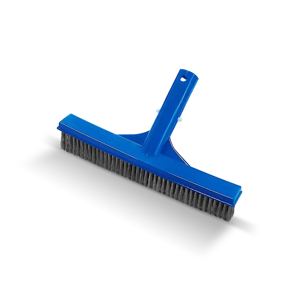 Cepillo recto Vulcano. Cuerpo plástico de 25 cm de largo y 4 hileras de cerdas de acero inoxidable; utilizado para limpieza de paredes en piscinas revestidas.