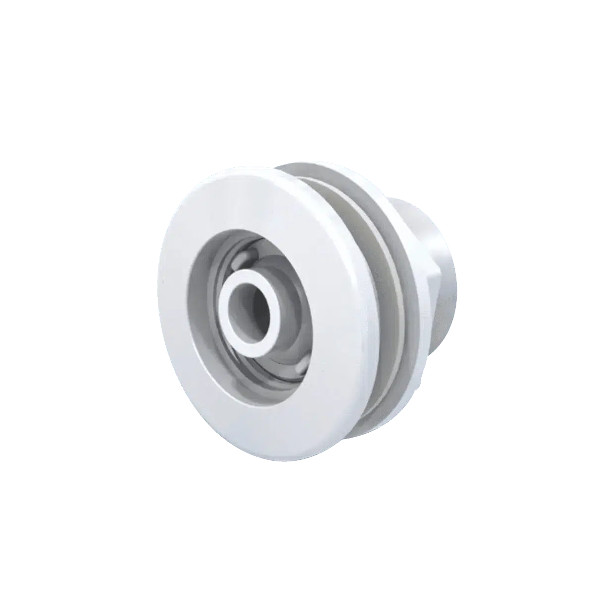 Retorno orientable Vulcano para piscina de fibra de vidrio. Posee aro desmontable blanco, cuerpo con rosca hembra de 1 1/2″ y boquilla esférica con pico de ø19 mm para ser instalado por debajo del nivel de agua. Diseñado para producir flujo en dirección al skimmer o toma de fondo, y así, favorecer a la limpieza y filtrado de la pileta.